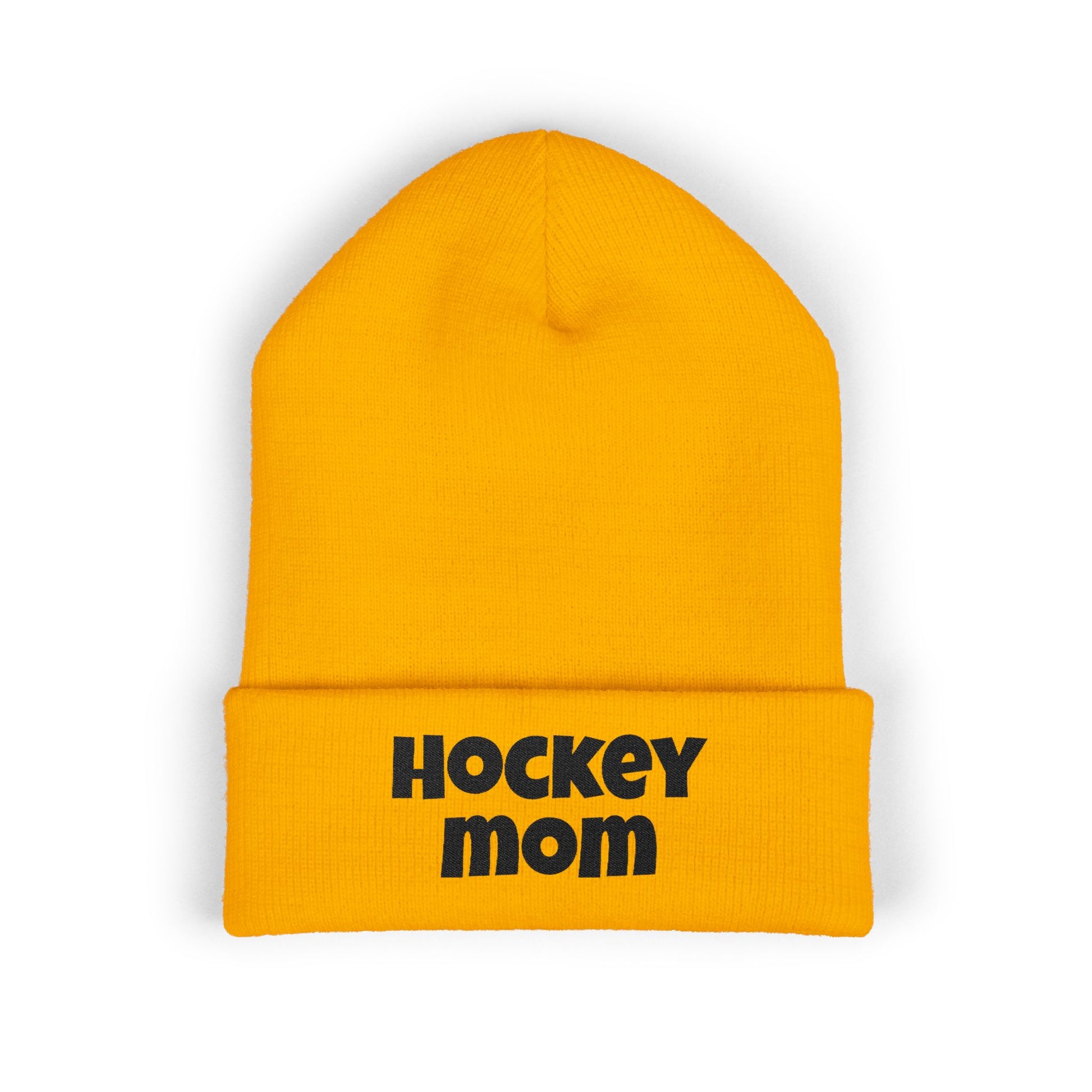 Hockey mom beanie to keep your head warm in the cold ice rink. A stylish and stretchy cuffed beanie with unique embroidery decoration, perfect for hockey moms to stay cozy during games. Ideal for winter sports enthusiasts and hockey fans. Relevant for winter holidays and hockey season.